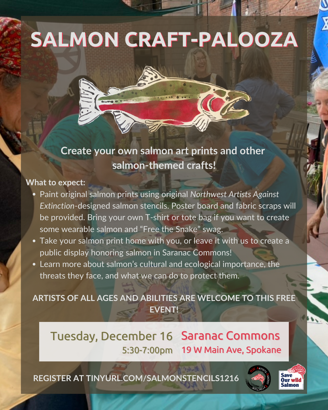 What: Join Save Our wild Salmon and Art Salvage to use stencils and salvaged art supplies to create beautiful salmon and orca prints. Original Northwest Artists Against Extinction-designed stencils will be available to artists of all ages and abilities to create inspiring advocacy artwork, while learning about salmon’s cultural and ecological importance and the urgent need to protect them.